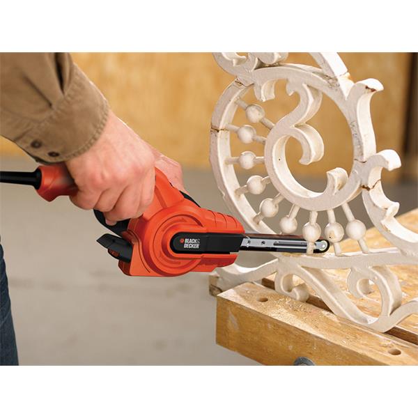 BLACK + DECKER KA900E Powerfile™ Belt Sander with a 13mm sanding belt, that is ideal for sanding, shaping, filing, sharpening and rust removal applications. Variable speed for optimal control and finish when sanding wood, metal, ceramic tiles, masonry, plaster and plastic.