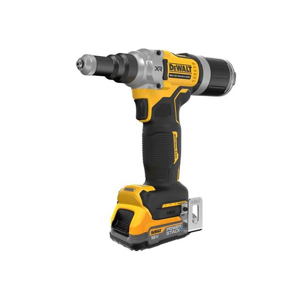 DEWALT DCF414 XR 1/4in Riveter with a tool-free nose piece and powerful brushless motor delivers longer run times, less maintenance and better power control. Its 30mm stroke length allows for fastening rivets in one stroke. Suitable for installing aluminium, steel and stainless steel blind rivets up to 6.3mm. The on-board mandrel collector store spent mandrels. Fitted with an ergonomic comfort grip handle for increased balance and tool control. There is also a bright integrated LED work light that enhances the work area in low light areas.