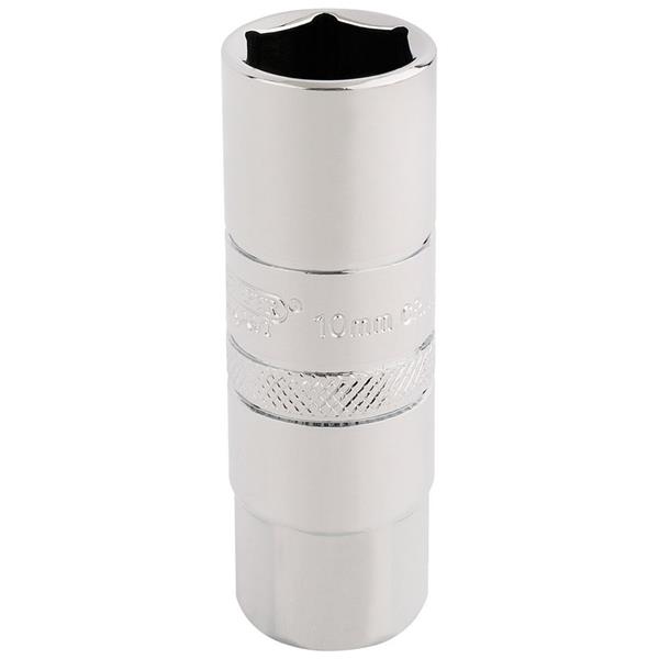 Expert Quality, 6 point deep socket with a rubber insert for plug protection and retention. Manufactured from chrome vanadium steel hardened and tempered with a polished finish. Socket length 65mm. Each socket has a knurled ring for extra grip.