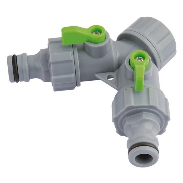 2-Way tap connector, made from robust plastic suitable for use with garden hose, sprinklers and taps.
