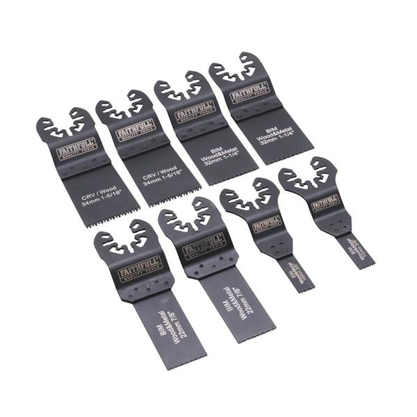 The XMS Mixed Multi-Tool Blade Set, 8 Piece, made by Faithfull, has eight of the most commonly used multi-tool blades. Consisting of: