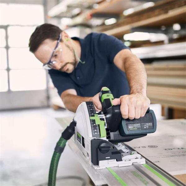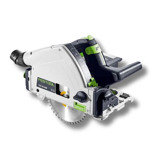 The kickback is the most common cause of serious injuries when using a plunge-cut saw. The unique kickback stop therefore stops the saw blade of the Festool 577025 TSC 55 KEB-Basic cordless plunge-cut saw in the blink of an eye, and so not only protects your workpiece but also minimises the risk of injury to your hands. In addition, this now allows users to make powerful, precise cuts at up to twice the speed with an extended battery range. When combined, our new generation of saw blades allows for maximum cutting performance and perfect cutting quality. The sawing system is rounded off with clever system accessories, such as guide rails, an angle stop, splinter guard and saw table.