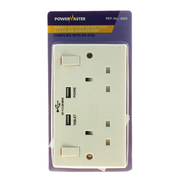 Powermaster SWITCHED SOCKET 2 GANG 13 AMP + 2 USB