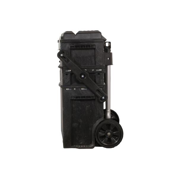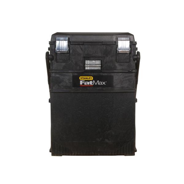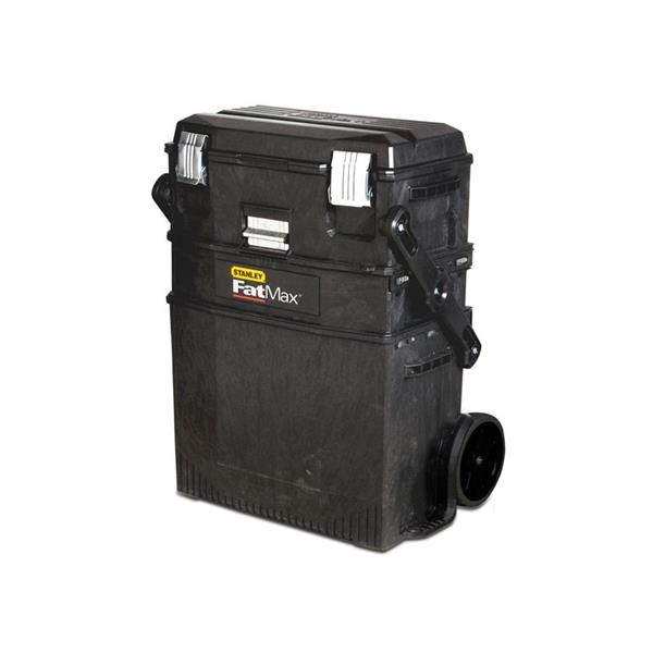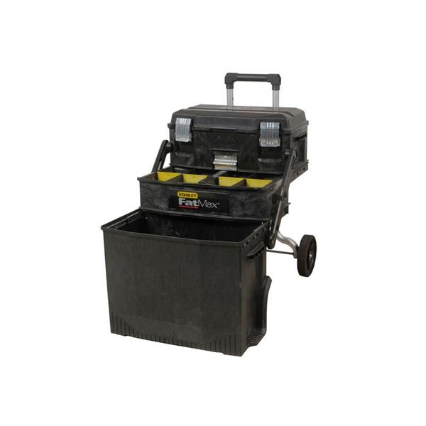 The STANLEY® FatMax® Cantilever Rolling Workshop is the ideal solution for tradesmen who need to transport large amounts of equipment and materials to the worksite. It saves time and effort on repeated trips to the van. The telescopic handle provides easy manoeuvrability. It opens up easily into a 4-level workstation, with a giant lower bin, which is for bulky materials and equipment such as paint cans, large components and power tools. There is a toolbox with a lift out tray for smaller tools, which fits neatly in to the fold out lid, along with a large adjustable organiser for nails, screws and other small components.